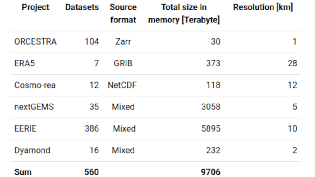First Cloudify was developed on a virtual machine called eerie.cloud (Wachsmann et al. 2026, paper in preparation) as an experimental service to offer open and standardized Zarr access to all EERIE simulations. What began as a small proof of concept quickly turned into a powerful bridge between HPC and cloud-based workflows. Researchers could now explore Petabytes of high-resolution climate data using familiar cloud tools, while the data itself never left the disk storage. Over time, eerie.cloud evolved into a shared, production-grade service — adopted for projects such as NextGEMs, Orcestra, and DYAMOND — and is now growing into DKRZ’s dedicated “km-scale cloud.” Nearly 6 Petabyte of EERIE simulation data (in memory size) are made available through the eerie.cloud (see Table 1 below) , which in total exceeds the S3 size DKRZ could allocate projects as a fair share.