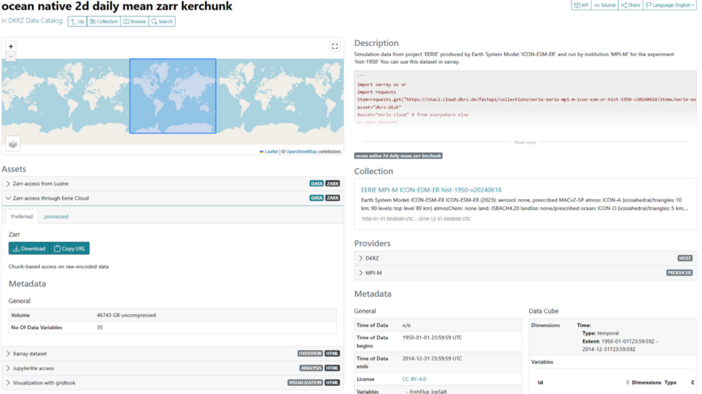 Within EERIE, the team laid the foundation for efficient future STAC indexing of km-scale ESM output. We created STAC item templates specifically tailored for our virtual datasets. Each dataset comes with rich metadata — including experiment descriptions, coordinate information, direct access URLs. In Figure 1, the STAC-browser view on such an item is illustrated.