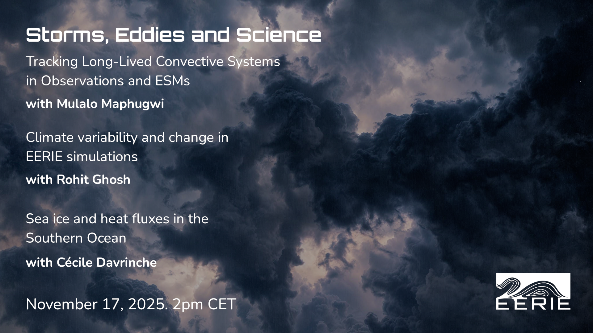 OnlineOn May 19, our Storms, Eddies and Science Hour will feature EERIE project scientists Amber Sneddon (UCT) speaking about “Climatology of Atmospheric Rivers in the South Atlantic Basin using modern image processing-based methodology” and Martín Lotto Batista (BSC) on "Leveraging Earth Observation data to predict leptospirosis outbreaks in Argentina". The session will be moderated by …