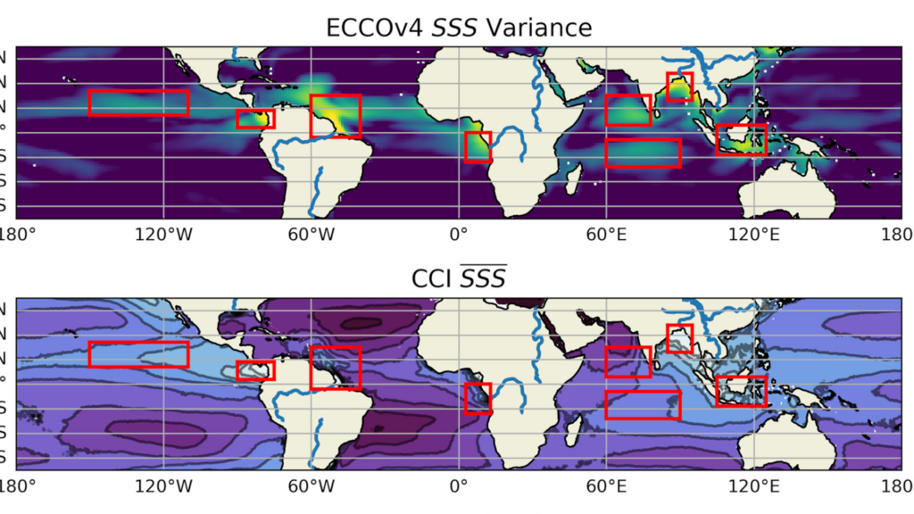 Climate-coupled models typically overestimate the amplitude of the seasonal cycle of sea surface salinity (SSS) in the tropics. A better understanding of the mechanisms controlling the seasonal variance of SSS could provide directions for improving the representation of the SSS seasonal cycle amplitude in these models. In this work, we use a novel framework, based on seasonal salinity variance budget (SVB), which we apply to the Estimating the Circulation and Climate of the Ocean (ECCO) state estimate, to study the mechanisms controlling the variance of seasonal SSS in the tropical oceans. Our findings reveal that oceanic advection, vertical diffusion, and freshwater fluxes from rivers and precipitation all play an important role in controlling the amplitude of the seasonal cycle, but their impact varies regionally. The SVB framework effectively distinguishes between “source” (mechanisms that enhance variance) and “sinks” (mechanisms that dampen variance). We show that vertical diffusion acts as the primary sink across most regions, except for the eastern Arabian Sea where precipitation dominates as the main sink. In other regions of the tropical oceans, precipitation and river runoff act as sources of variance. The effect of the advective term on the SSS variance is shown to be mainly the sum of two terms—first, a term associated with the spatial redistribution of the variability by the eddy-parametrized oceanic circulation, and second, a term associated to a transfer of salinity variance between the time mean and seasonal circulations.
