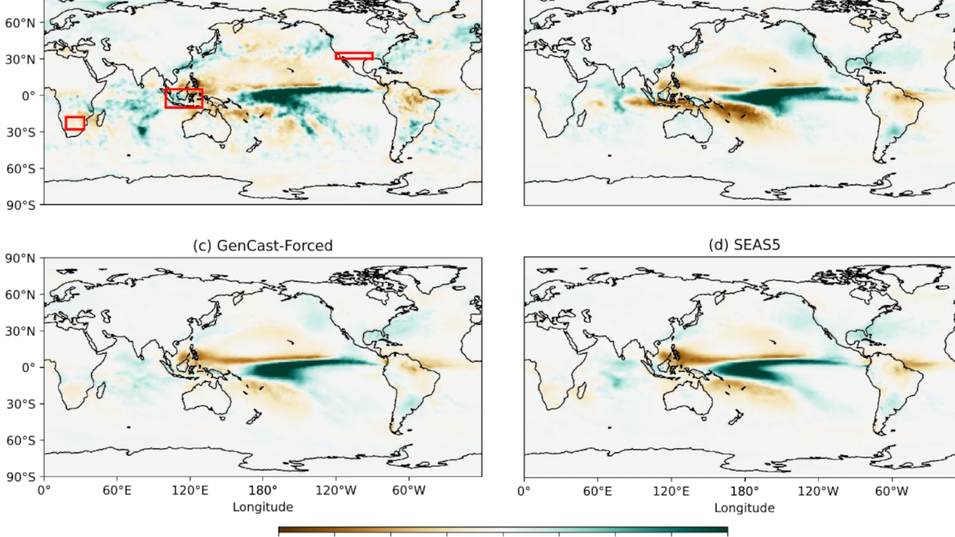 Machine-learnt weather prediction (MLWP) models are now well established as being competitive with conventional numerical weather prediction (NWP) models in the medium range. However, there is still much uncertainty as to how this performance extends to longer timescales, where interactions with slower components of the earth system become important. We take GenCast, a state-of-the-art probabilistic MLWP model, and apply it to the task of seasonal forecasting with prescribed sea surface temperature (SST), by providing anomalies persisted over climatology (GenCast-Persisted) or forcing with observed SSTs (GenCast-Forced). The forecasts are compared to the European Centre for Medium-Range Weather Forecasts seasonal forecasting system, SEAS5. Our results indicate that, despite being trained at short timescales, GenCast-Persisted produces much of the correct precipitation patterns in response to El Niño and La Niña events, with several erroneous patterns in GenCast-Persisted corrected with GenCast-Forced. The uncertainty in precipitation response, as represented by the ensemble, compares favourably to SEAS5. Whilst SEAS5 achieves superior skill in the tropics for 2-metre temperature and mean sea level pressure (MSLP), GenCast-Persisted achieves higher skill in some areas in higher latitudes, including mountainous areas, with notable improvements for MSLP in particular; this is reflected in a slightly higher correlation with the observed NAO index. Reliability diagrams indicate that GenCast-Persisted has little skill relative to climatology, whilst GenCast-Forced produces forecasts with reliability comparable to SEAS5. These results provide an indication of the potential of MLWP models similar to GenCast for the ‘full’ seasonal forecasting problem, where the atmospheric model is coupled to ocean, land and cryosphere models.